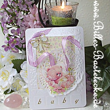 Schlicht aber reizvoll ist die Wirkung von Bändern, wenn Motive z. B. an den Enden sowie dem "Knotenpunkt" angebracht werden. Hier wurden Serviettenmotive genutzt und das Band so aufgeklebt, dass sie luftig-leicht auf der Karte liegen und noch etwas Leben in die Karte zaubern. |