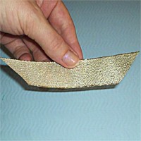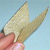 Nach dem trocknen beide Seiten - etwas versetzt - miteinander verkleben. Goldband mit Hilfe einer Nähnadel befestigen und an die Schnur drei Perlen (3 mm) verknoten. |